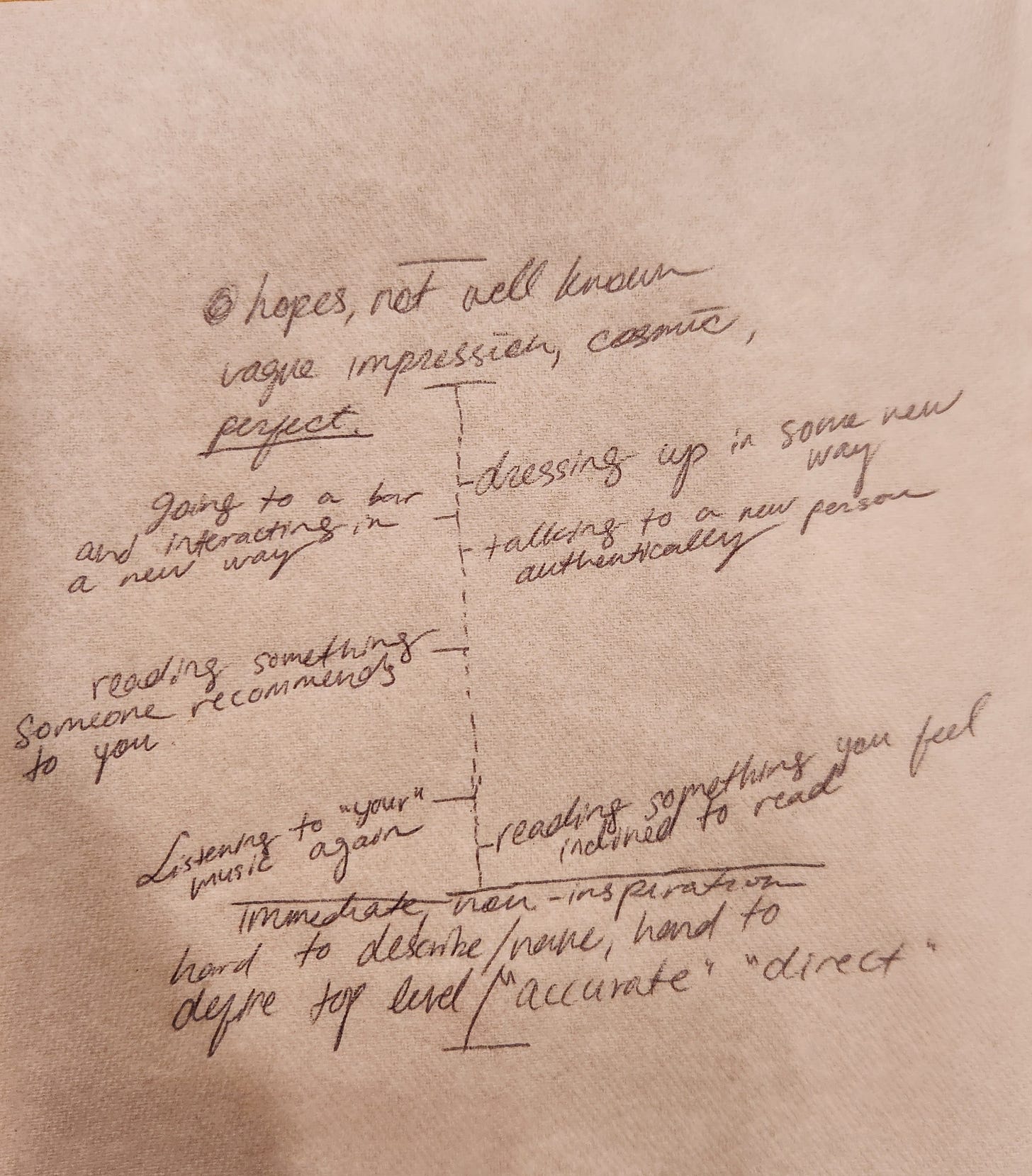 Below I have written on a napkin a kind of scaffold. The archetypes you can reach for, the immediate feelings, and then ways to “activate participation beyond your feelings, and enact physically the archetypes” in the middle.