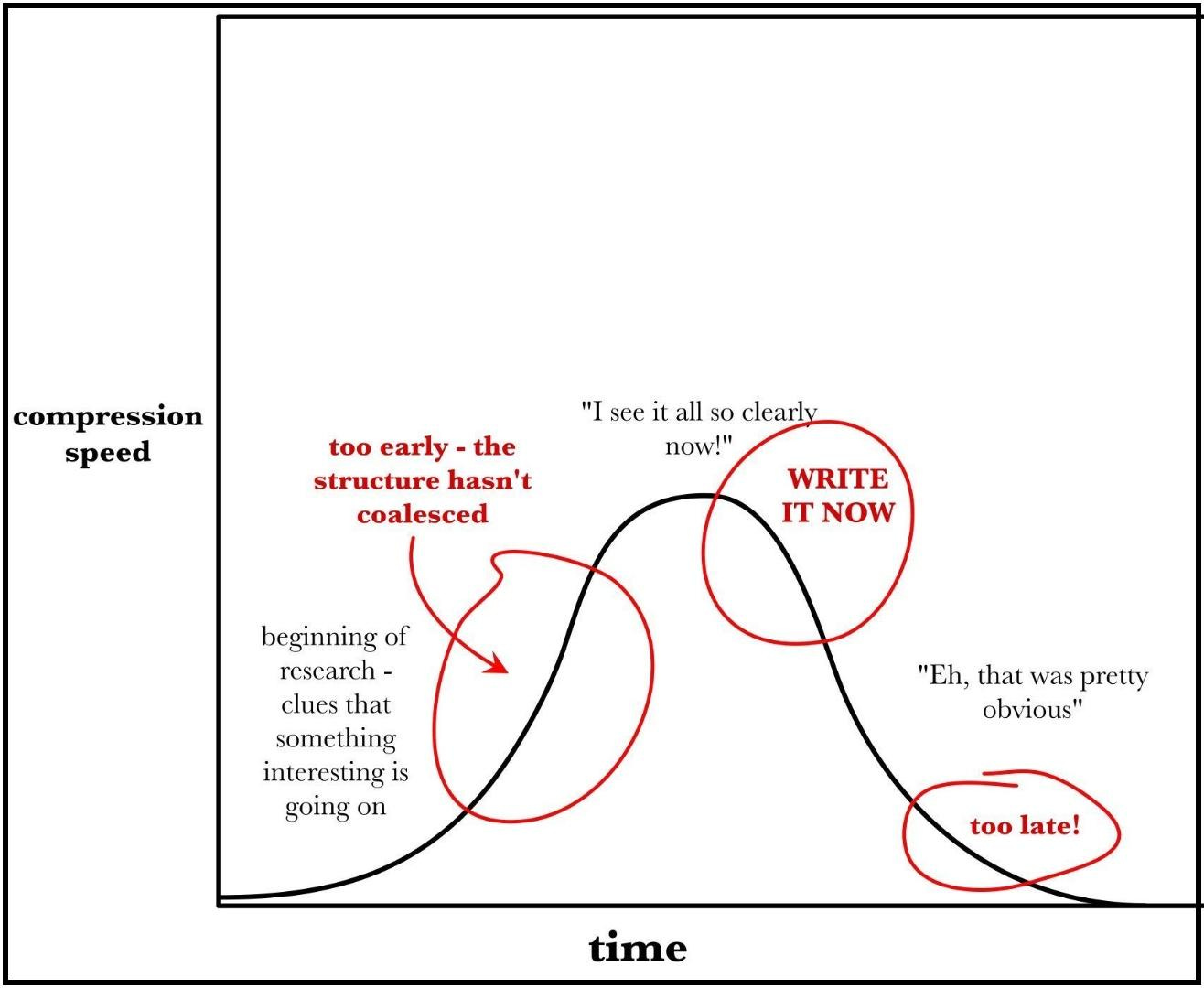 Literally, do not let it exist except through the format of letting people talk to you about it. This is okay if the topic is controversial, easily misunderstood, or the benefits to you are limited, or the idea really is just not ready to be explained. A lot of ideas don’t get written because the process for generating ideas is a lot faster than the process of manifesting them. However, if you want a piece of writing to exist and it does not, not existing is indeed a real failure mode.
