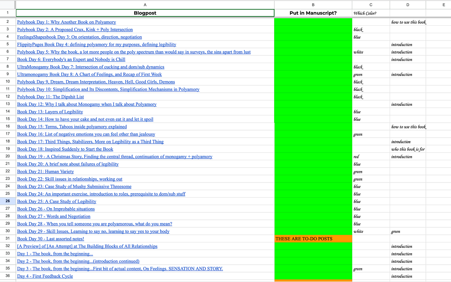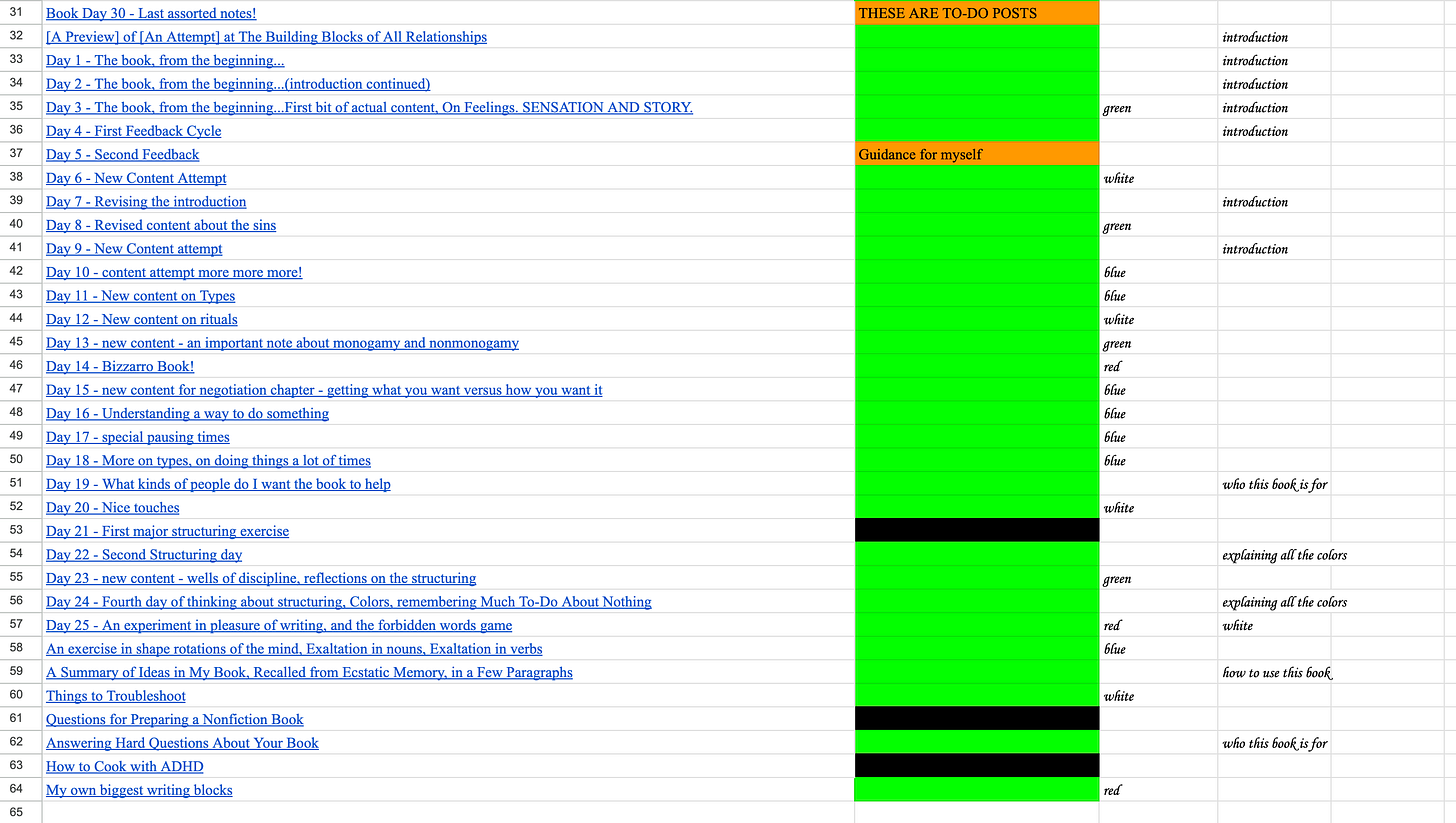 What is striking to me about this chart is that so many parts of the book are covered, over me writing over 63 days, without me putting “effort” into “thinking about making sure different parts are covered.” And then the order of them being covered being kind of random! You can see that in the beginning, more posts are relevant to the “introduction” but not all of them! And then a cluster of more posts relevant to the “introduction” come up again in the middle and then again near the end!