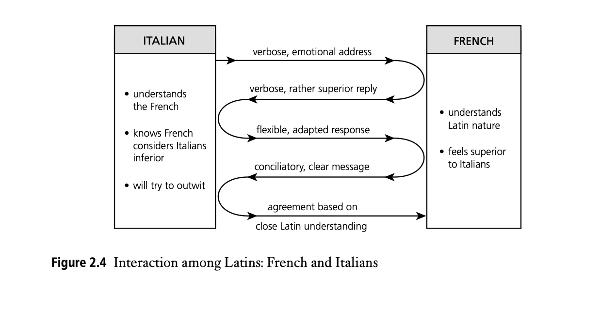 A person who has actually seen a negotiation between Italian and French businessmen escalate would not mind for a chart to exist modeling what they saw if it clarifies some overwhelm, solves a conflict, or leads to a business deal.