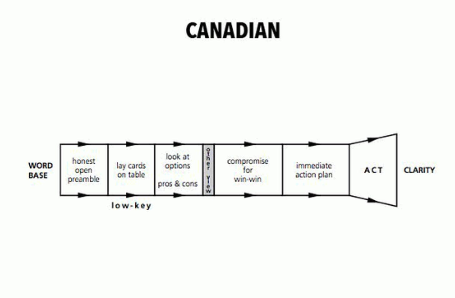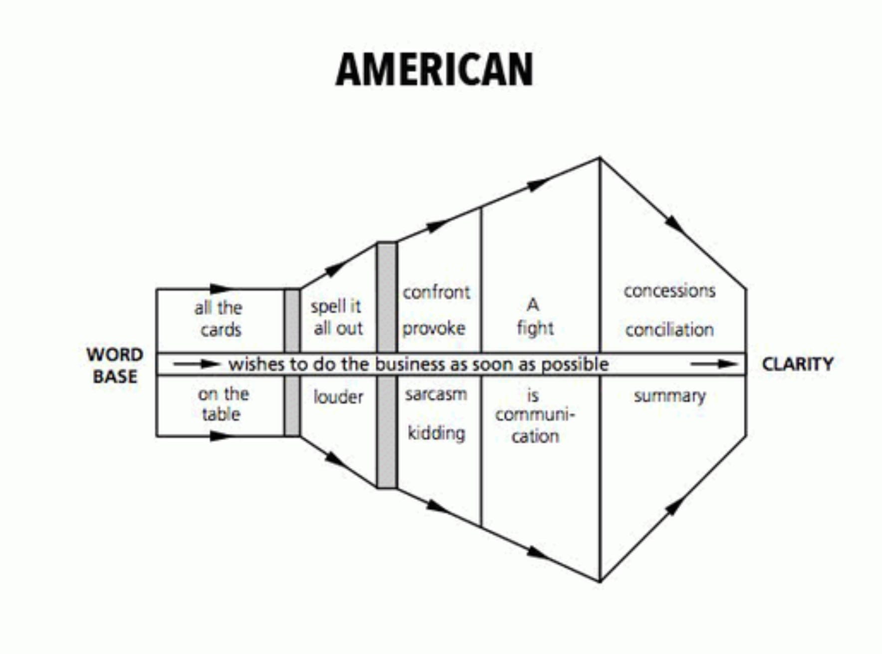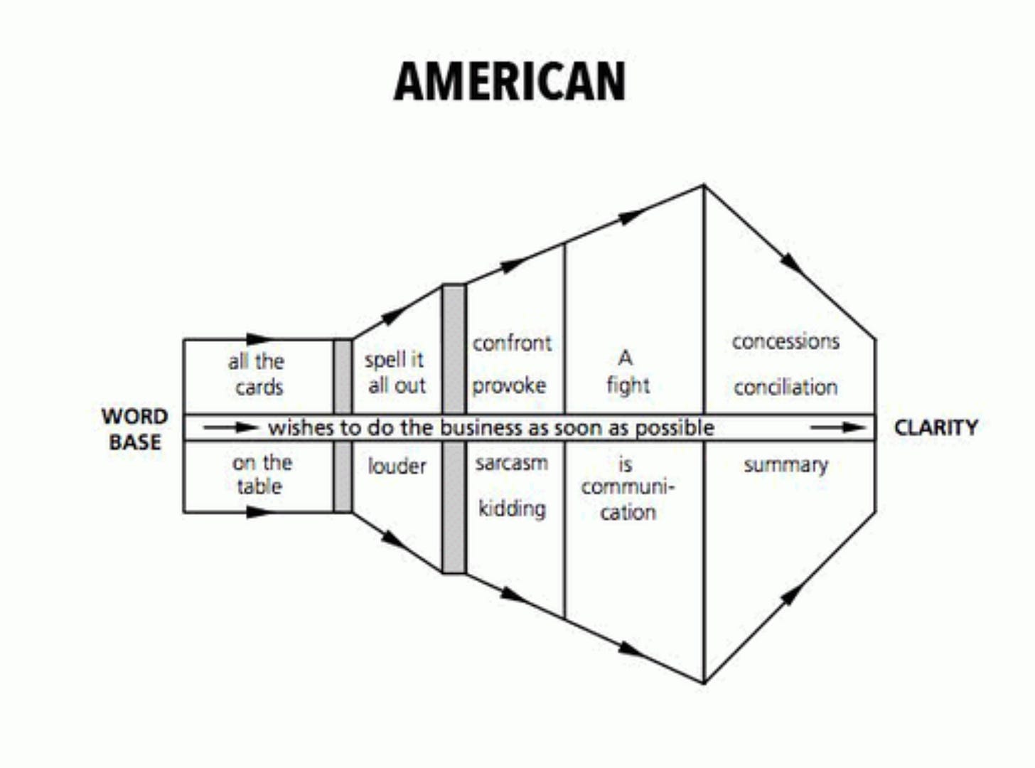 As an aside, there is a book I like, When Cultures Collide, by Richard D. Lewis, an exquisite two-pound tome that has fantastic charts about how different cultures participate in business negotiations.